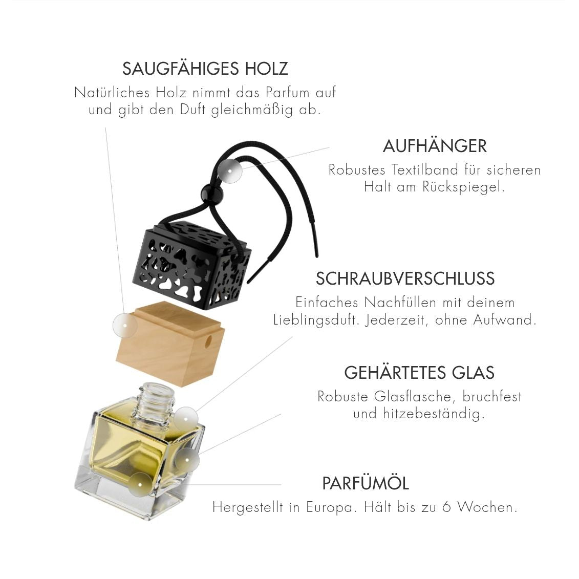 Ardeni Auto Duft – Inhalt des Sets mit Flakon, Holzdeckel und Aufhängung